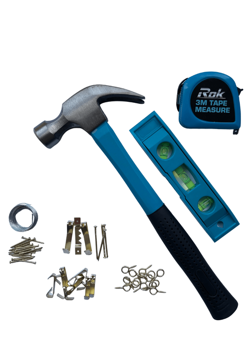 - This set is the complete hanging solution with Claw Hammer, Torpedo Level, 3m Tape Measure & plenty of Assorted Hardware to get the job done