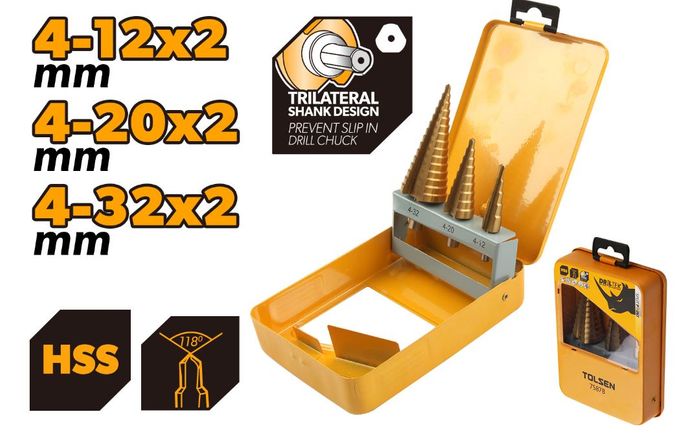 • STEP DRILL BITS 3PC 12,20,32 x 2MM